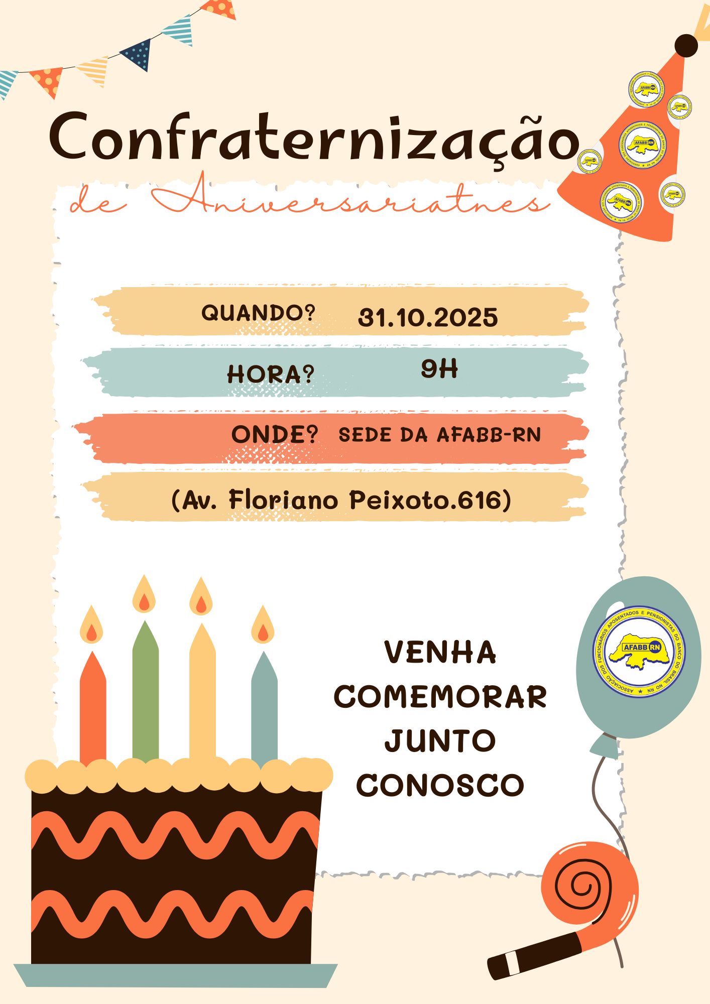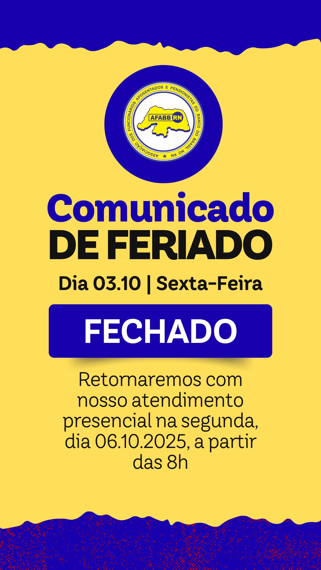 A AFABB-RN informa que amanhã, sexta-feira, dia 03.10.2025, estará com seu atendimento presencial suspenso devido ao feriado estadual dos mártires de Cunhaú e Uruaçu. Retornaremos com nossas atividades presenciais na segunda-feira, dia 06.10.2025, a partir das 8h. Mais informações através do 3212-1331 e de nosso WhatsApp 99818-2632 ( não recebemos ligações). CASSI – SUPERÁVIT – … Continued