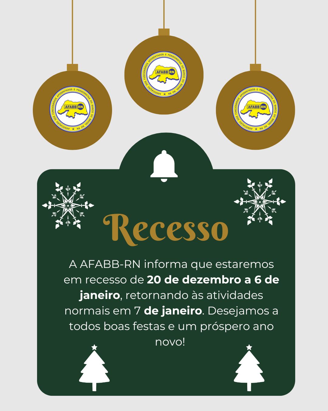 A AFABB-RN informa que estará em recesso de 20.12.2025 a 06.01.2026, ficando com suas atividades presenciais suspensas , retornando dia 07.01.2026.